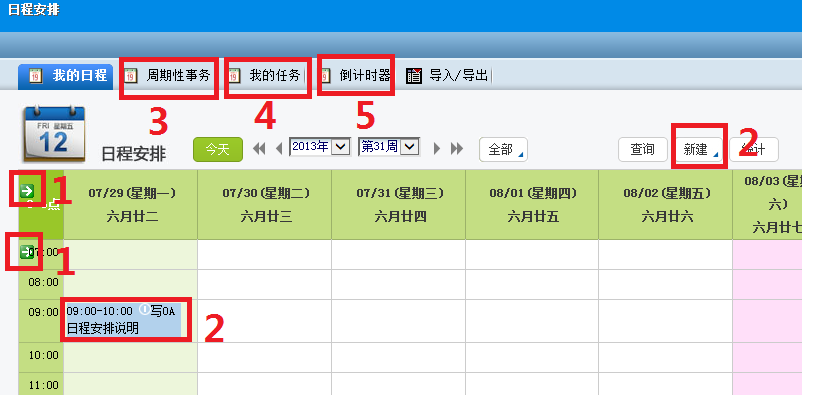 2.點擊【新建】可新建日事務、周事務、月事務和工作日志,也可單擊在每日空白處,可直接新建該時間段的日程安排,還可以把鼠標放在當前事務上通過拖拽的方法快速修改當前事務并建立新的事務,而且根據(jù)根據(jù)事務的緊急重要程度顯示不同的顏色,默認為藍色。