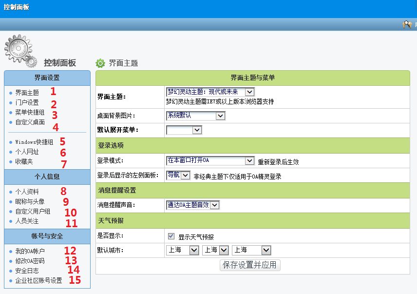 【個(gè)人事務(wù)】-【控制面板】包括界面主題、個(gè)人資料、我的帳戶等15個(gè)功能。