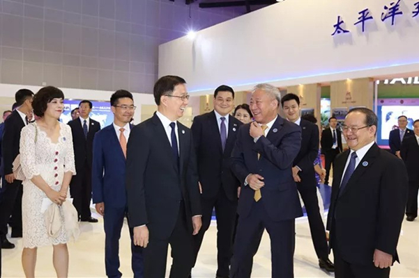 開幕大會(huì)后,韓正在廣西壯族自治區(qū)黨委書記鹿心社,廣西壯族自治區(qū)黨委副書記、自治區(qū)人民政府主席陳武等自治區(qū)領(lǐng)導(dǎo)的陪同下,視察了位于博覽會(huì)主展館的太平洋建設(shè)展位。