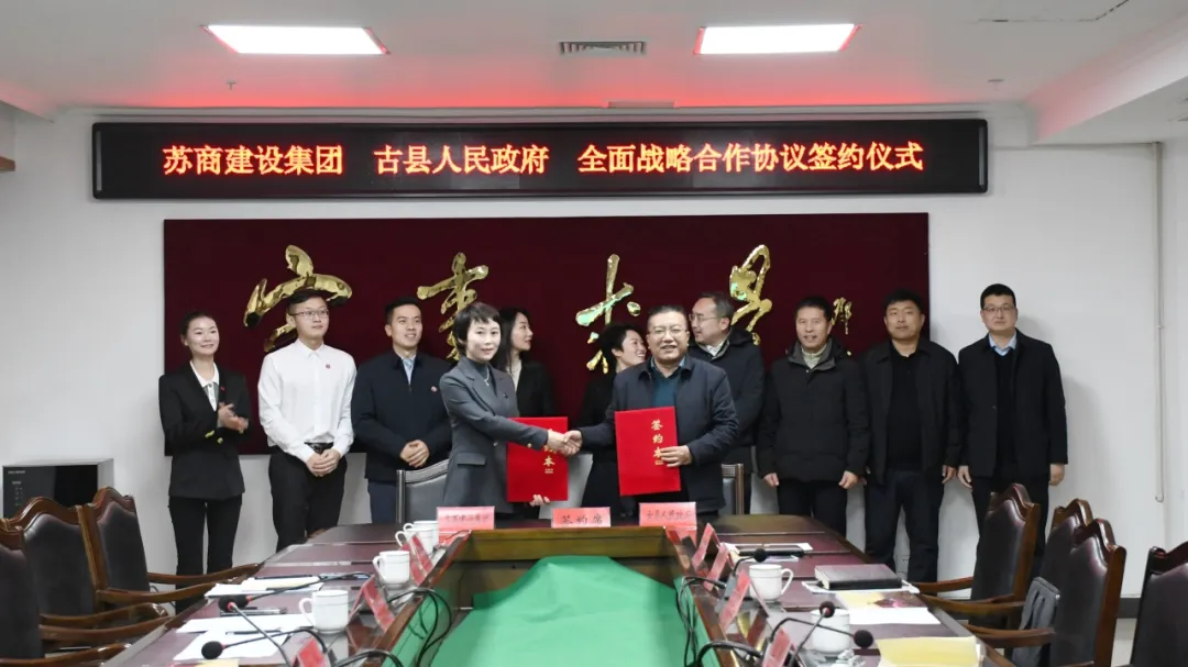 1月15日,蘇商集團(tuán)同山西省臨汾市古縣人民政府在當(dāng)?shù)睾炇饝?zhàn)略合作協(xié)議。蘇商集團(tuán)董事、CEO俞文,古縣縣委副書(shū)記、縣長(zhǎng)李晶出席簽約儀式并講話。云舒建設(shè)董事局主席楊文玲、古縣縣委常委、宣傳部部長(zhǎng)李國(guó)鋒代表雙方簽約。古縣副縣長(zhǎng)周興出席簽約儀式。